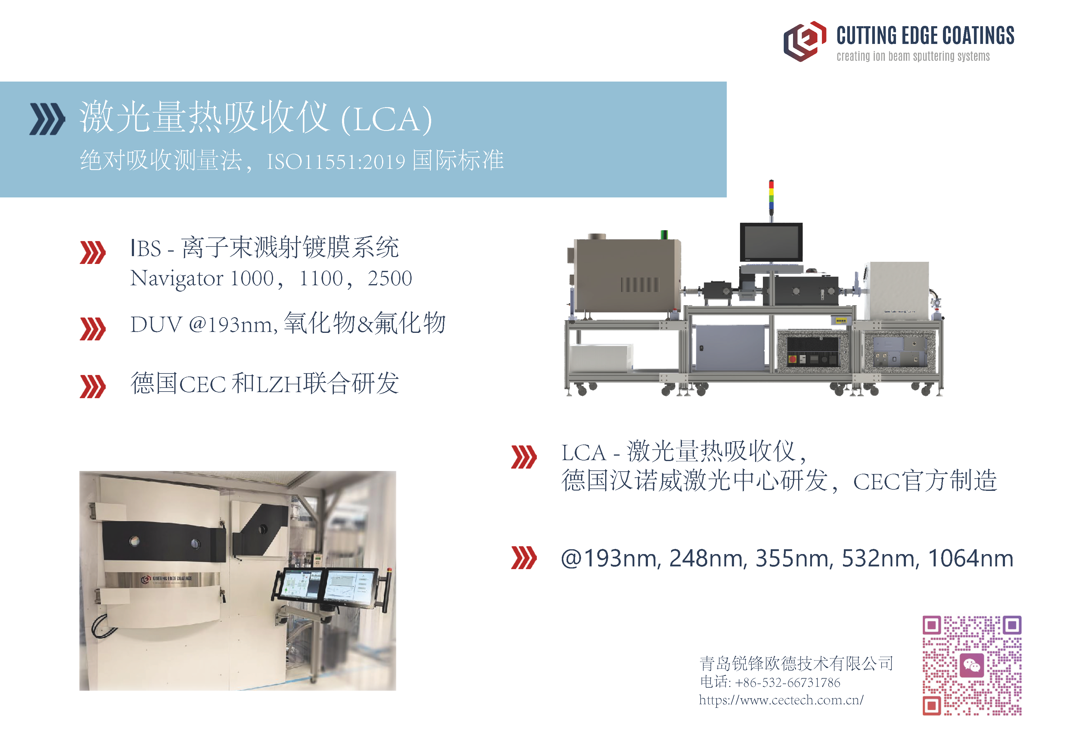 深紫外波段,尤其是193nm波长,已成为当前光学薄膜技术领域的研究与应用热点。随着光刻、精密光学检测及高端激光系统等前沿领域对光学元件性能要求的不断提升,传统电子束蒸发镀膜工艺在膜层致密性、均匀性、应力控制以及本征吸收等方面的局限性日益凸显,已难以满足现代超高精度、超低损耗深紫外膜系的严苛技术指标。 为此,德国CEC公司联合汉诺威激光中心共同研发了基于氟化物材料的离子束溅射(IBS)镀膜设备。该设备专为深紫外波段优化设计,具备优异的工艺可控性和沉积稳定性,可实现氟化钙(CaF₂)、氟化镁(MgF₂)等关键紫外材料的高质量、低缺陷、低吸收薄膜制备,显著提升膜层的激光损伤阈值、环境稳定性和光学性能一致性。 与此同时,汉诺威激光中心自主研发的激光量热吸收仪(LCA),严格依据国际标准ISO 11551:2019进行设计与校准,可在193纳米波长下实现光学元件的绝对吸收值高精度测量。其测量结果具有高度的可重复性与溯源性,已被全球多家顶级光学实验室和制造商广泛采用,成为深紫外光学元件吸收性能评估的行业基准与权威工具。自2026年2月起,德国CEC公司正式成为汉诺威激光中心指定的激光量热吸收仪(Laser Calorimetric Absorber,简称LCA)官方合作伙伴,全面负责该系列产品的研发、生产与制造工作。依托汉诺威激光中心在高精度激光能量测量领域的深厚技术积淀,以及CEC在精密光学仪器制造方面的专业能力,双方携手推动激光量热吸收仪的技术升级与产业化应用。该系列产品可根据客户实际应用场景和测试需求,灵活定制适配多种典型激光波长,包括但不限于193nm、248nm、355nm、532nm及1064nm等主流波段,广泛适用于科研机构、工业激光设备制造商、计量检测实验室及高校光学实验室等各类高端用户场景。