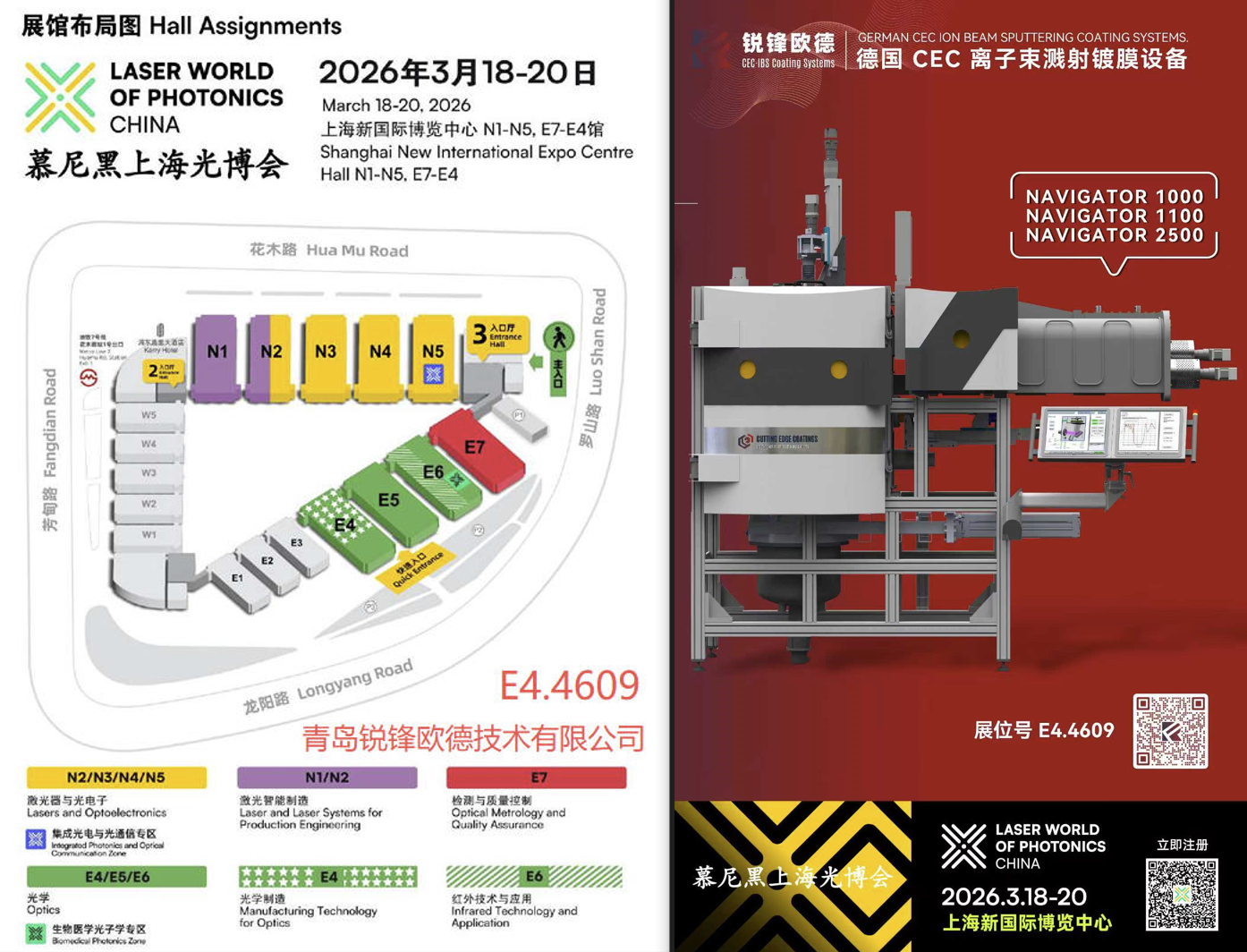 青岛锐锋欧德技术有限公司将携德国Cutting Edge Coatings GmbH(简称德国CEC)的高端离子束溅射镀膜设备及高精度激光量热吸收仪,亮相2025年3月18日至20日在上海新国际博览中心举办的慕尼黑上海光博会。本次展会,我司将在E4馆4609号展位设立专业展示区,全面呈现德国CEC在光学薄膜制备与激光材料性能测试领域的前沿技术成果与成熟解决方案。诚挚欢迎新老客户莅临展位参观交流,我们将安排技术专家现场为您详细讲解设备原理、应用案例及定制化服务支持,共同探讨光学镀膜与激光测量技术的发展趋势与合作机遇。