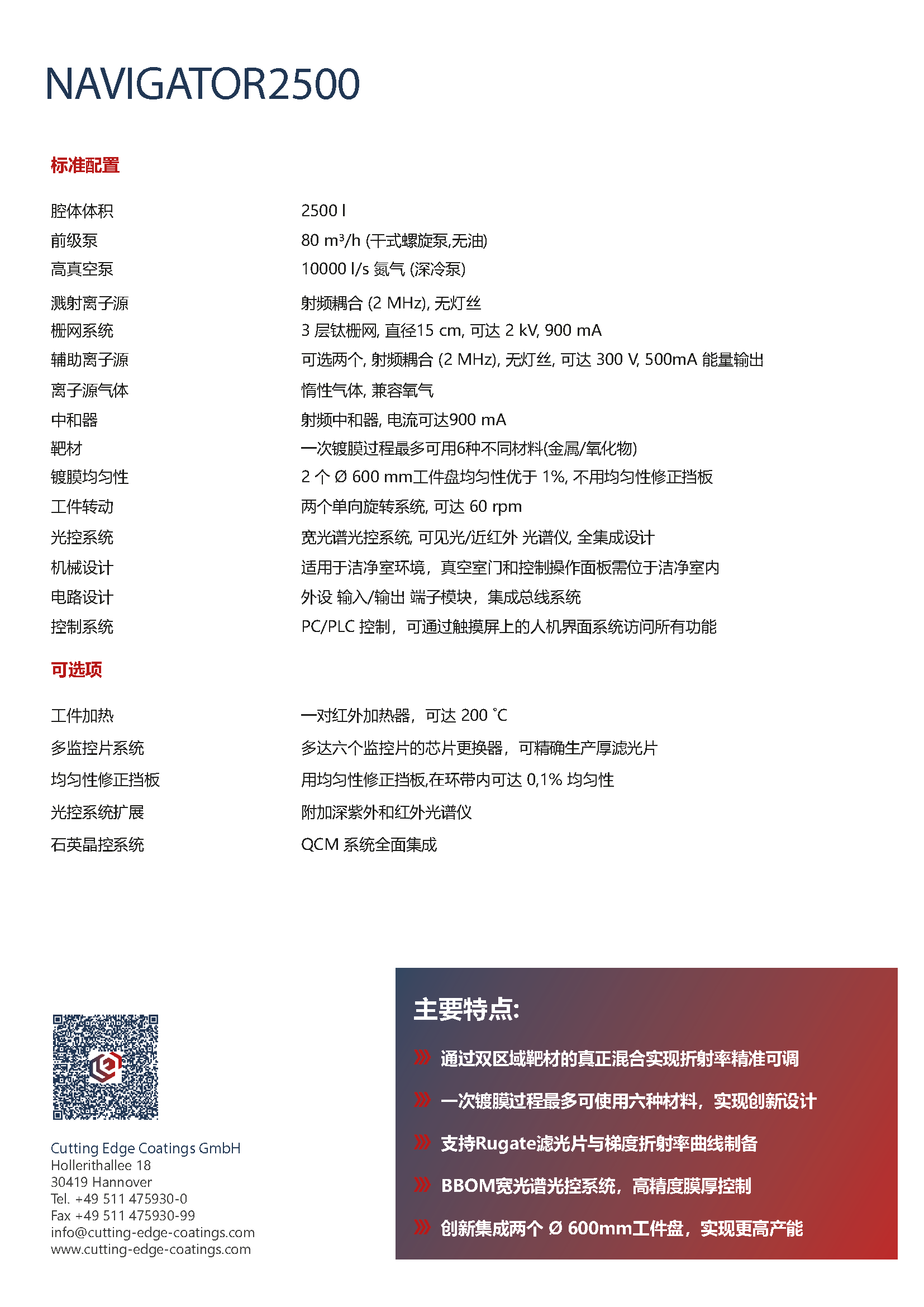 德国CEC公司最新推出的Navigator 2500离子束溅射镀膜设备,可同时处理两个直径达600毫米的大口径工件,或单个直径达800毫米的光学元件,大幅提升了镀膜效率与工艺精度,在高端光学镀膜领域展现出卓越性能。